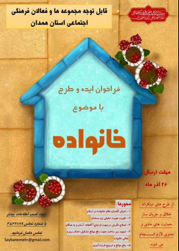 فراخوان دریافت ایده و طرح با محوریت خانواده از سوی ستاد مردمی جبهه فرهنگی استان همدان منتشر شد.