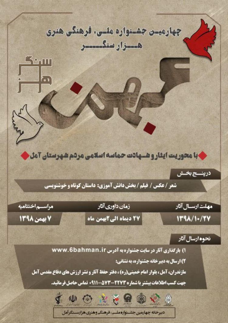 این جشنوراه با محوریت ایثار و شهادت حماسه اسلامی مردم آمل در پنج بخش شعر، عکس، فیلم، بخش دانش آموزی؛ داستان کوتاه و خوشنویسی برگزار خواهد شد.