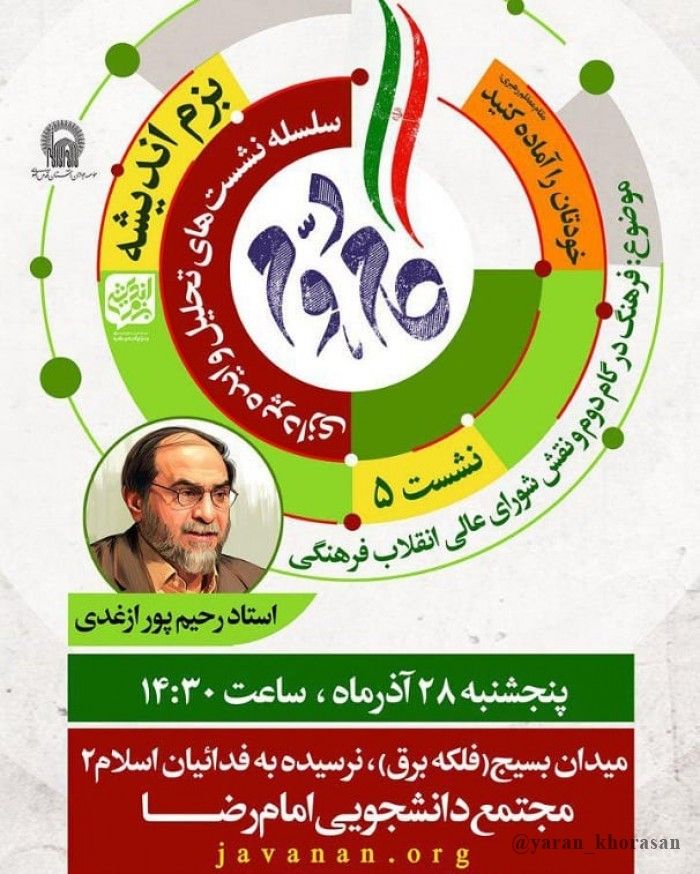 پنجمین نشست از سلسله نشست های «بزم اندیشه» با موضوع فرهنگ در گام دوم و نقش شورای عالی انقلاب فرهنگی فردا پنجشنبه ۲۸ آذرماه برگزار می گردد.