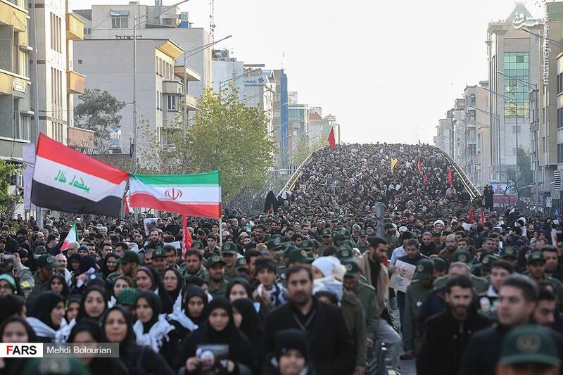 تصویری زیبا از موج جمعیت حاضر در مراسم تشییع پایتخت و اهتزاز پرچم ایران و عراق در مراسم تشییع امروز تهرانیها.