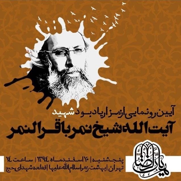 به گزارش حلقه وصل، آئین رونمایی از نماد یادبود شهید آیت الله شیخ نمر باقرالنمر روحانی شیعی برجسته عربستانی برگزار میشود.