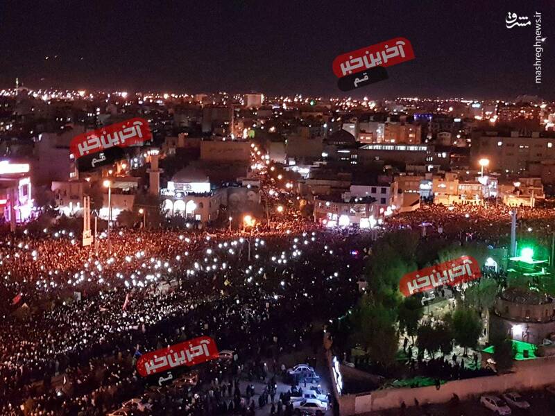 نمای زیبا در ابتدای بلوار پیامبر اعظم قم با روشن کردن نور موبایلها، همزمان با ورود پیکر مطهر سردار شهید حاج قاسم سلیمانی و همرزمانشان بین جمعیت.