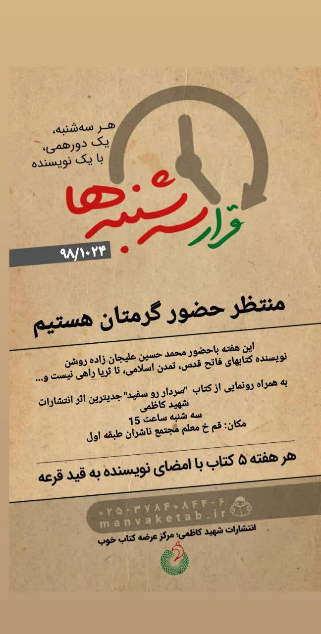 حلقه وصل: سه شنبه های هر هفته یک دورهمی صمیمی و دوستانه پیرامون کتاب و کتابخوانی با حضور یک نویسنده ارزشی و انقلابی از سوی انتشارات شهید کاظمی با عنوان «قرار سه شنبه ها» برگزار می شود.