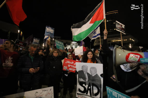 به گزارش حلقه وصل، تظاهراتکنندگان پلاکارتهایی به زبانهای عبری و عربی در دست داشتند که محتوای آنها رد معامله قرن، مخالف با الحاق اراضی اشغالی فلسطینی و امثال آن بود.