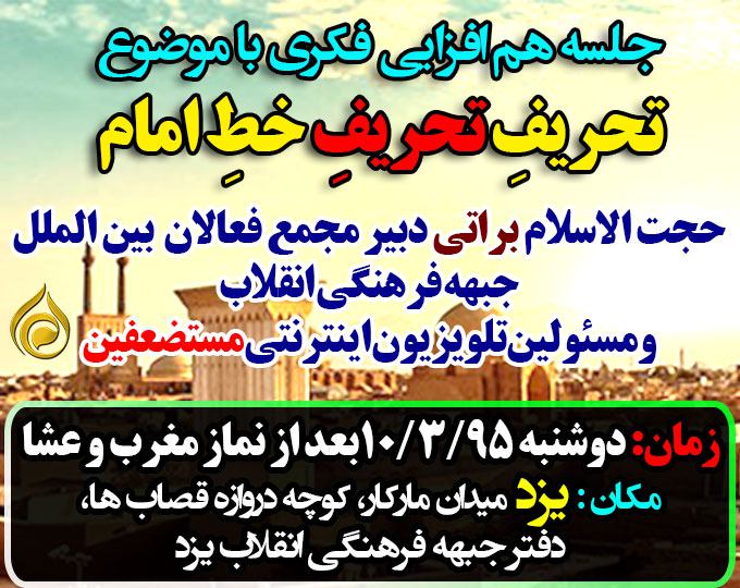 حجت الاسلام علیرضا نجیمی دبیر جبهه فرهنگی انقلاب اسلامی یزد به حلقه وصل گفت: همزمان با ایام رحلت امام خمینی(ره) جلسه هم افزایی فکری با موضوع تحریف تحریف خط امام با همکاری تلویزیون اینترنتی مستضعفین برگزار می گردد.