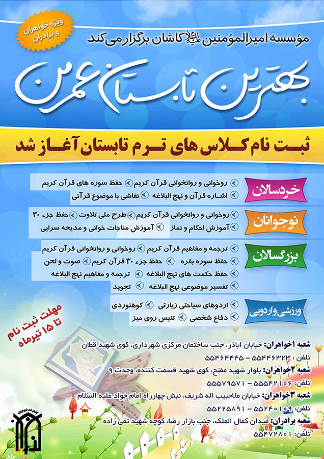 حجت الاسلام حسن زاده مدیرمؤسسه امیرالمؤمنین(ع) کاشان به حلقه وصل گفت: ثبت نام کلاس های ترم تابستان با عنوان بهترین تابستان عمر من برای گروه های سنی خردسالان، نوجوانان و بزرگسالان آغاز شده است.