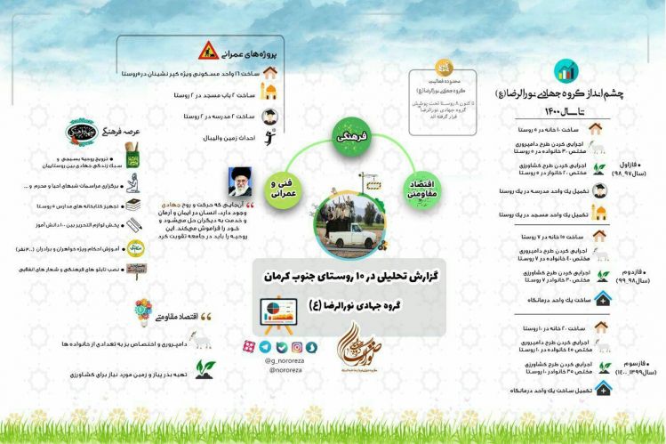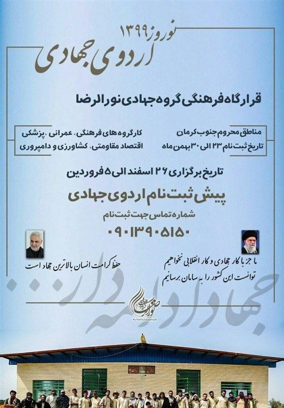 به گفته مسئول قرارگاه فرهنگی گروه جهادی نورالرضا(ع) قرار است این گروه جهادی در ایام نوروز ۹۹ به مناطق محروم استان کرمان اعزام شود که البته زمان ثبتنام این اردوی جهادی از روز چهارشنبه ۲۳ بهمن ماه آغاز شده و تا پایان امروز(۳۰ بهمن) ادامه خواهد داشت.