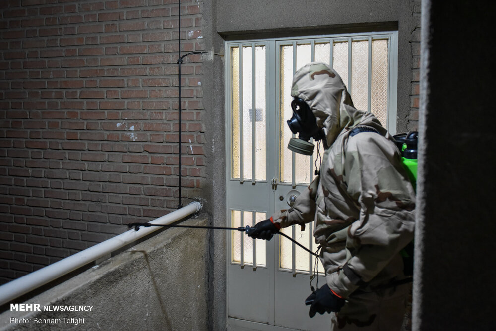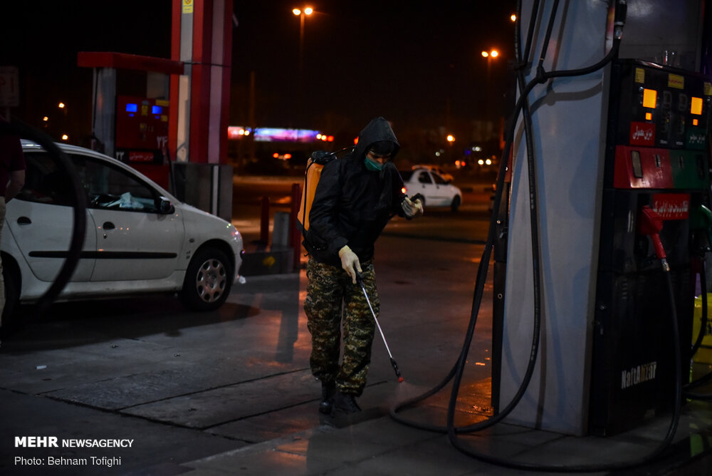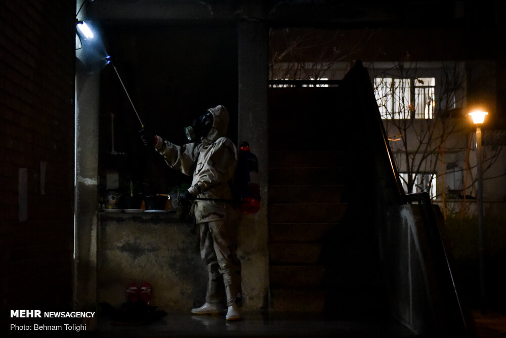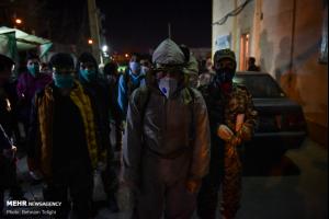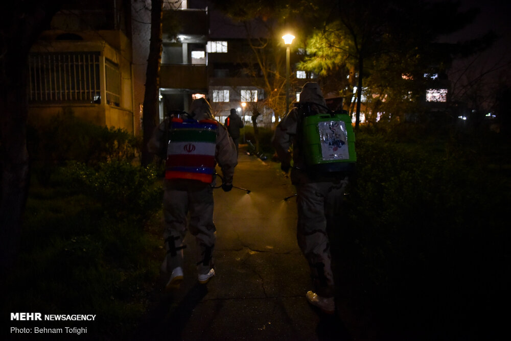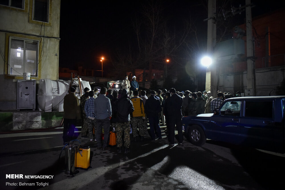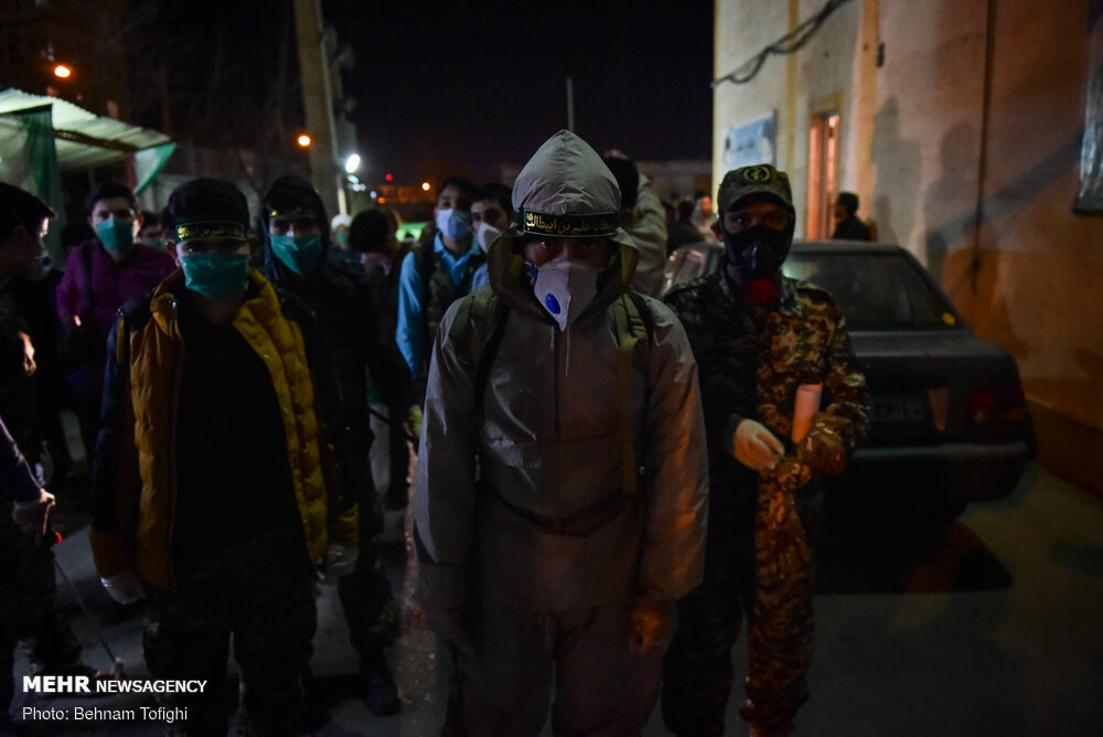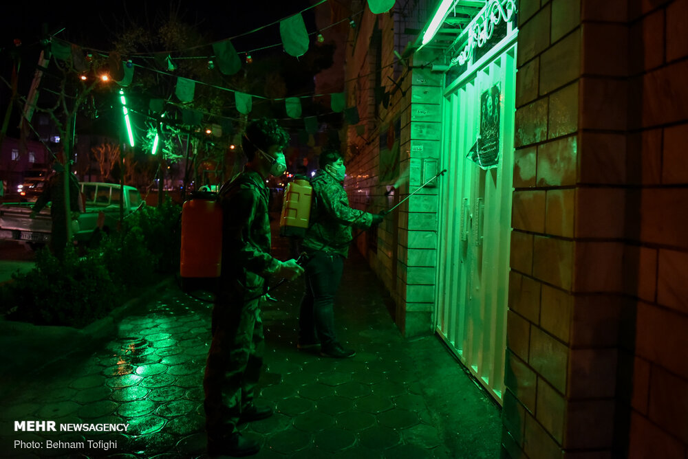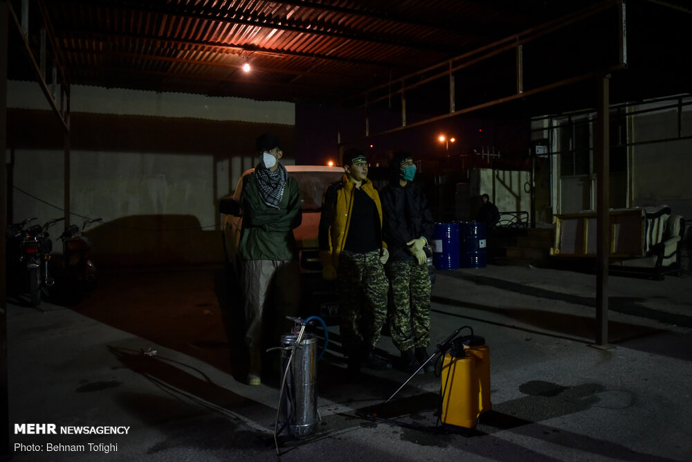 گروهی از جوانان جهت جلوگیری از انتشار ویروس کرونا به صورت بسیج مردمی با تهیه مواد ضد عفونی کننده و لوازم مورد نیاز هر شب در نقاط مختلف تهران محلهای عبور و مرور را ضد عفونی میکنند.