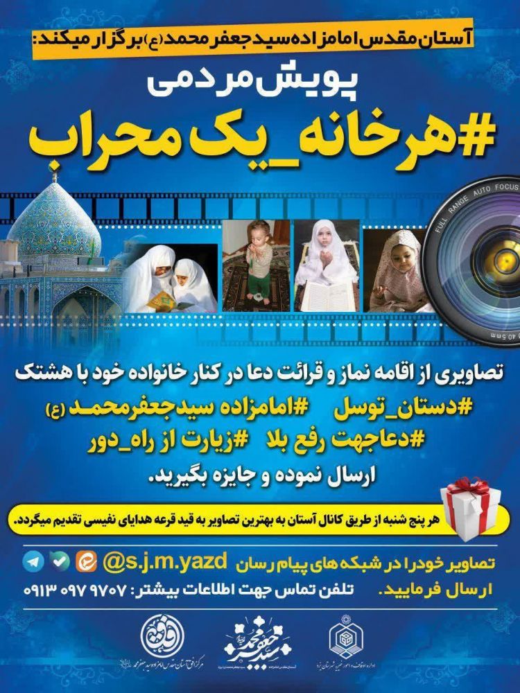 مردم دارالعباده استان میتوانند تصاویری از نماز و قرائت دعا در کنار خانواده خود را با هشتکهای «دستان توسل»، «امامزاده سیدجعفرمحمد(ع)»، «دعا جهت رفع بلا»، «زیارت از راه دور» از طریق شبکههای پیامرسان داخلی به آیدی s.j.m.yazd@ ارسال کنند.