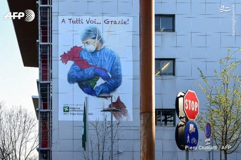 نقاشی دیواری در یک بیمارستان در شهر برگامو ایتالیا؛ پرستاری که ماسک به صورت دارد و پرچم ایتالیا را در آغوش گرفته/ خبرگزاری فرانسه