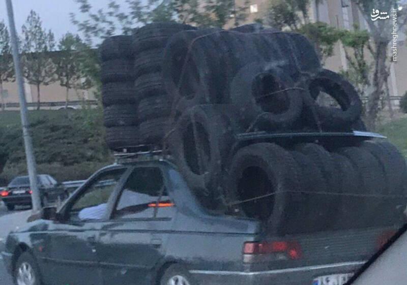 جابهجایی عجیب تعداد زیادی لاستیک خودرو با خودروی پژو را میبینید.