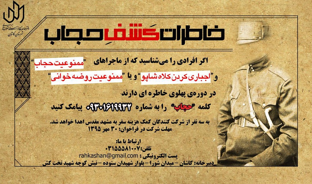 این فعال فرهنگی یادآور شد: مهلت شرکت در این فراخوان تا 30 مهرماه است و افراد می توانند در زمینه خاطرات ممنوعیت حجاب، اجباری کردن کلاه شاپو و ممنوعیت روضه خوانی اقدام به ثبت نام کنند.