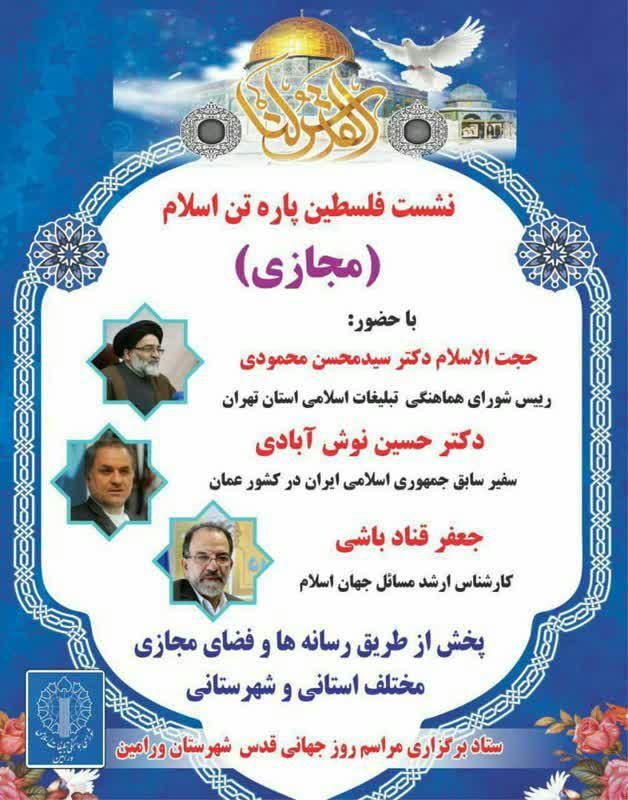 حلقه وصل: در راستای گرامیداشت روز جهانی قدس نشستی از سوی ستاد برگزاری مراسم روز جهانی قدس در ورامین به صورت مجازی برگزار می شود.