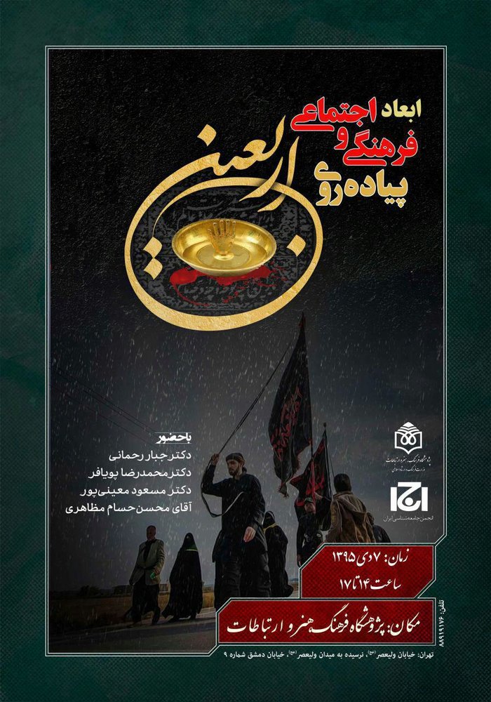 به گزارش حلقه وصل، پژوهشگاه فرهنگ، هنر و ارتباطات با همکاری انجمن جامعه شناسی ایران نشست ابعاد فرهنگی و اجتماعی پیاده روی اربعین را با حضور جبار رحمانی، محمدرضا پویافر، مسعود معینی پور و محسن حسام مظاهری برگزار می کند.