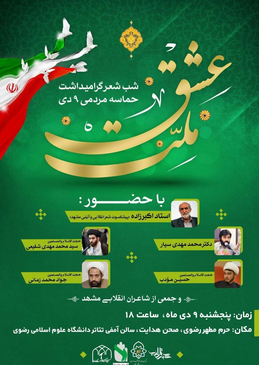 در همین راستا، بسیج دانشگاه علوم اسلامی رضوی در نظر دارد به مناسبت فرا رسیدن سالروز حماسه 9 دی، شب شعری را با عنوان «ملت عشق» برگزار کند.
