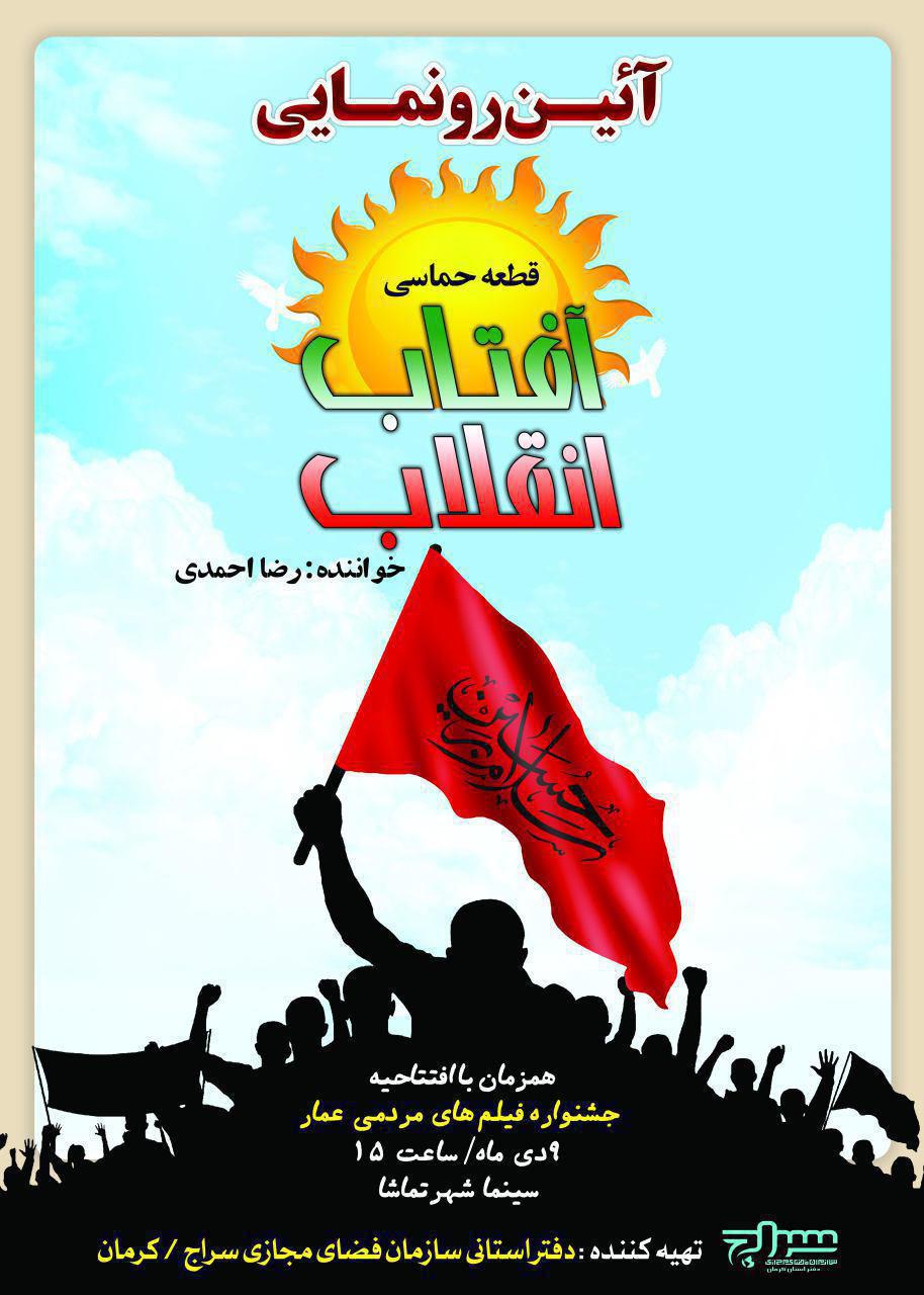 به گزارش سرویس استانهای حلقه وصل، همزمان با افتتاحیه هفتمین دوره جشنواره مردمی فیلم عمار و به مناسبت فرارسیدن یوم الله 9دی و سالروز حماسه بصیرتی مردم ولایتمدار کشورمان، آئین رونمایی از قطعه موسیقی حماسی «آفتاب انقلاب» با هنرمندی خواننده حماسی و آیینی رضا احمدی برگزار می شود.