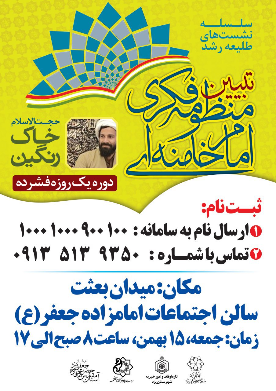 این فعال فرهنگی تصریح کرد: به همین منظور جلسه فشرده ای جمعه 15 بهمن ماه از صبح تا عصر در جهت تبیین منظومه فکری امام خامنه ای با حضور حجت الاسلام خاک رنگین در سالن اجتماعات امامزاده جعفر(ع)برگزار می شود.