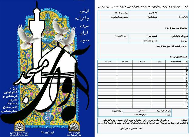 نخستین جشنواره سرود «آوای مسجد» ویژه گروه های سرود کانون های فرهنگی هنری شهرستان بندرعباس 18 فروردین ماه سال 96 به میزبانی کانون فرهنگی هنری منتظران ظهور در شهرک توحید برگزار می شود.