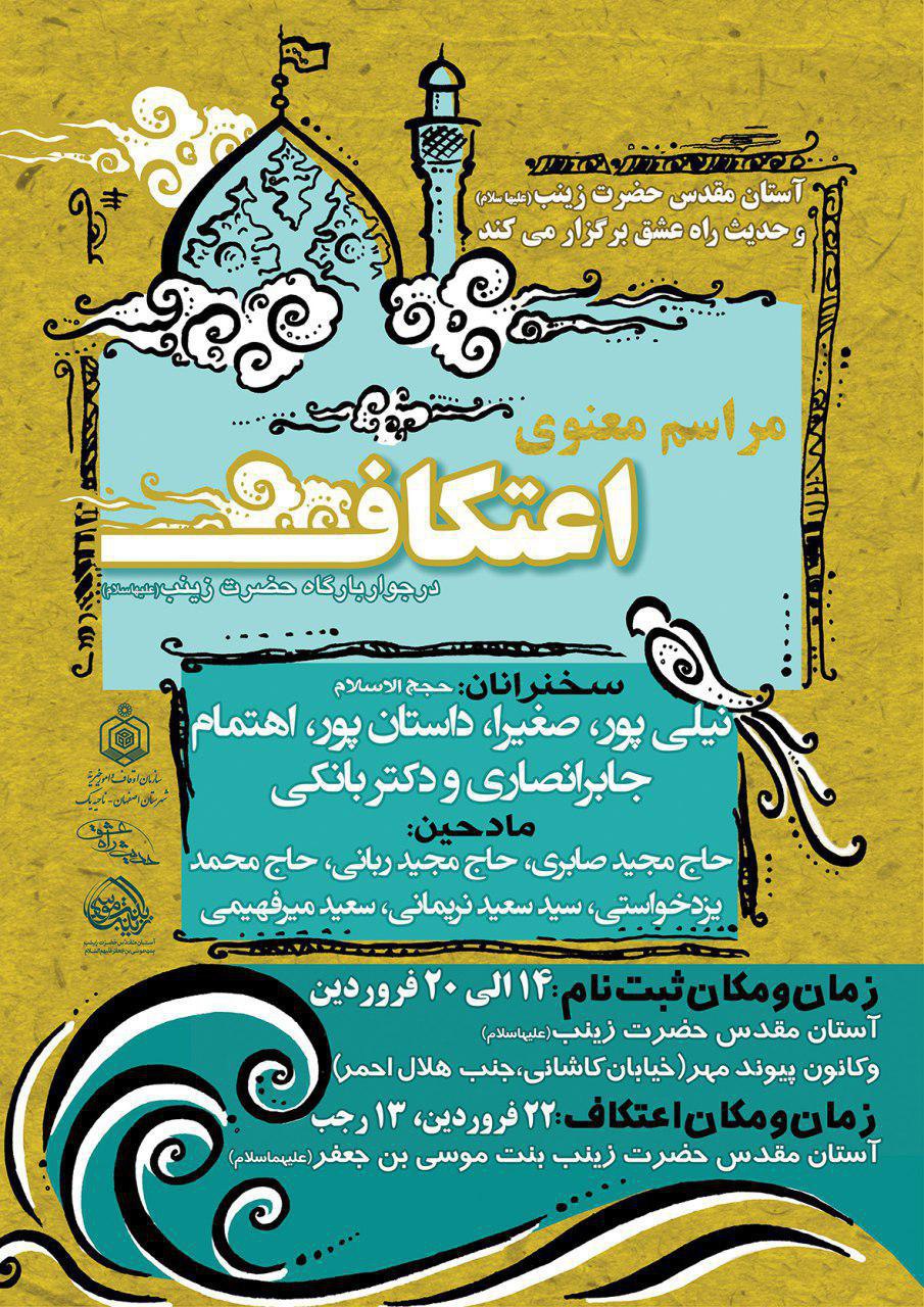 همچنین مراسم معنوی اعتکاف با مداحی حاج مجید صابری، حاج مجید ربانی، حاج محمد یزدخواستی، سید سعید نریمانی و سعید میرفهیمی همراه است.