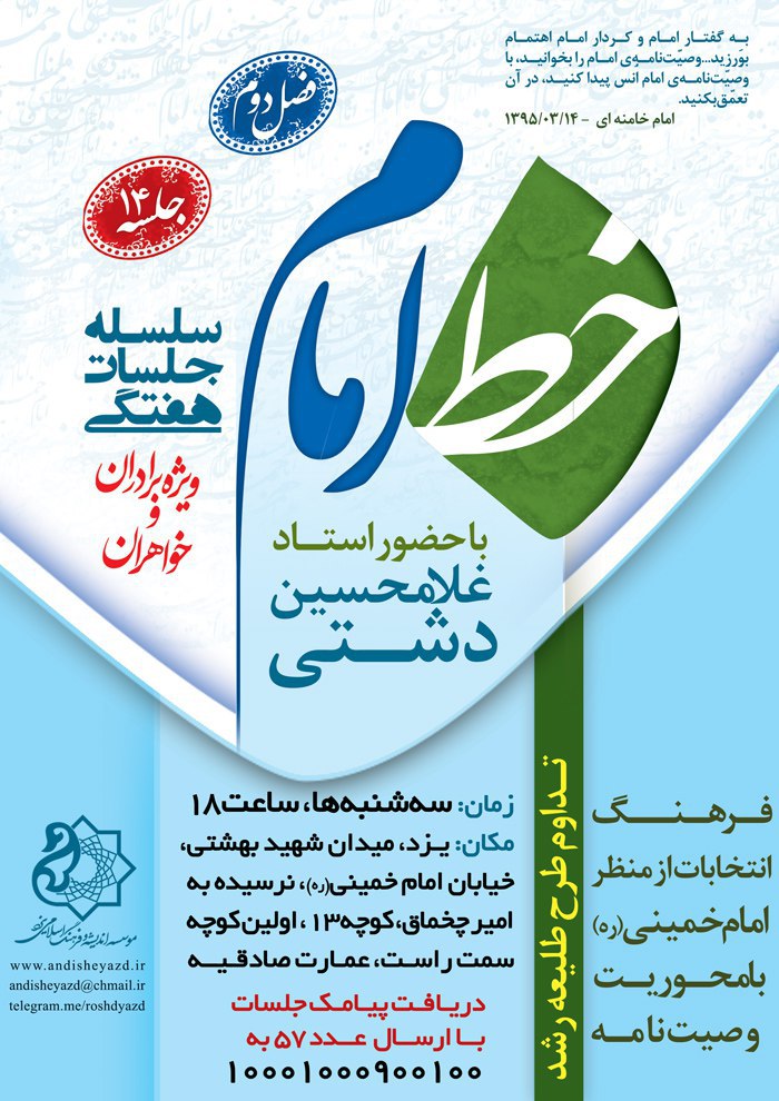 به گزارش سرویس استانهای حلقه وصل، با شروع سال جدید فصل دوم جلسات هفتگی«خط امام» عصر امروز در یزد آغاز می گردد.