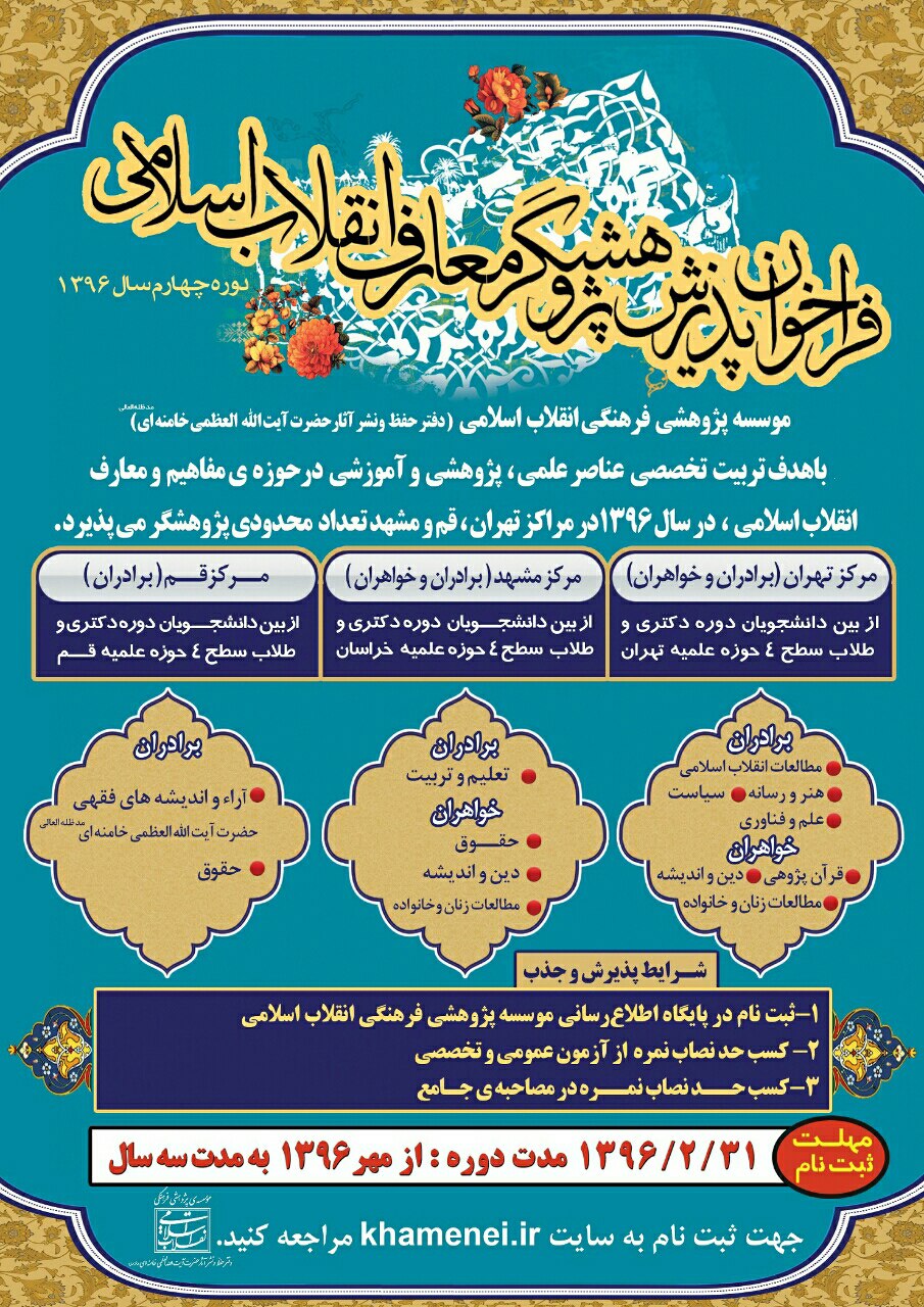 این مؤسسه در این فراخوان با هدف تربیت تخصصی عناصر علمی، پژوهشی و آموزشی در حوزه ی مفاهیم و معارف انقلاب اسلامی در سال 96 در مراکز تهران، قم و مشهد تعداد محدودی پژوهشگر می پذیرد.