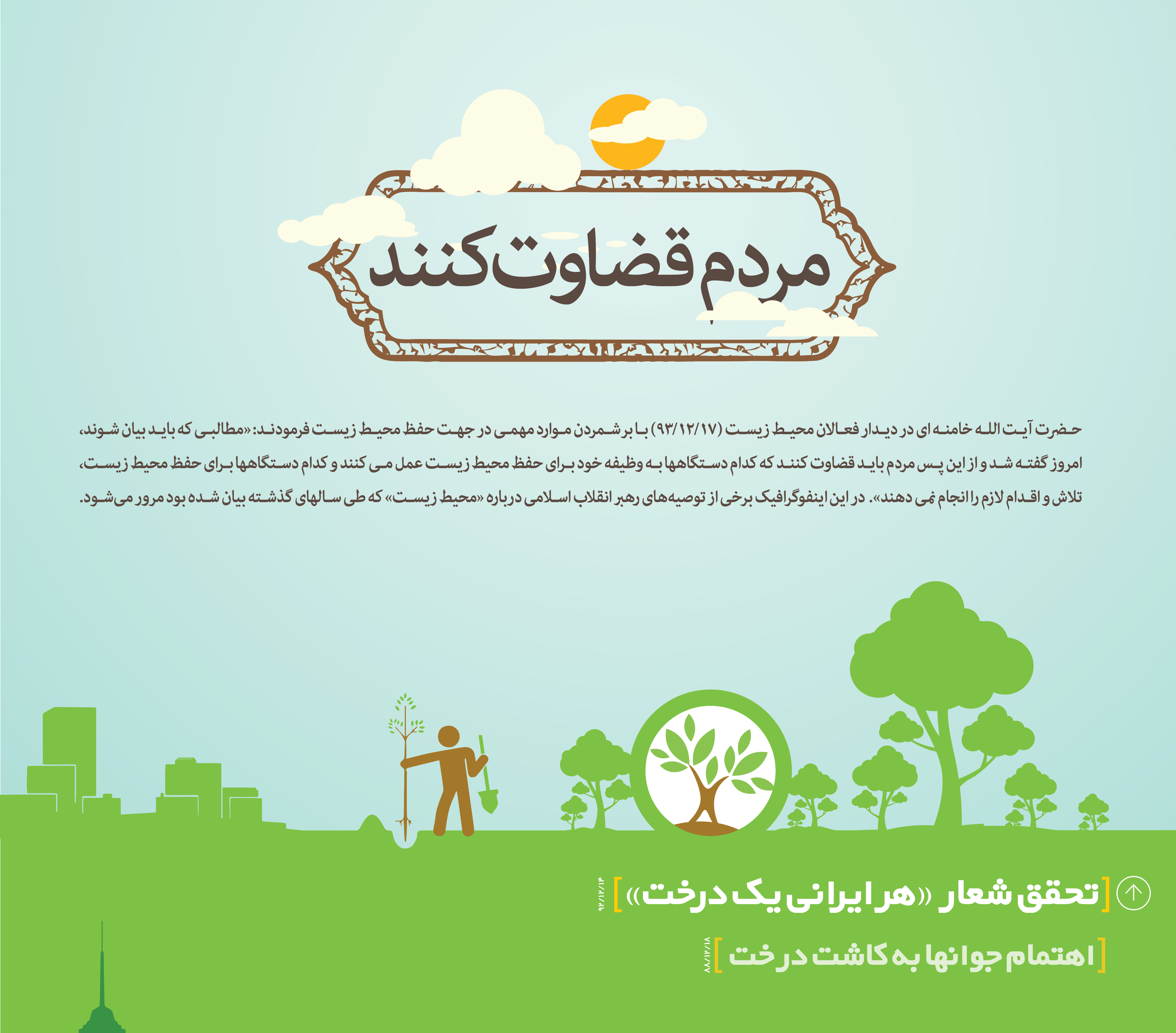 حضرت آیتالله خامنهای در دیدار فعالان محیط زیست با برشمردن موارد مهمی در جهت حفظ محیط زیست فرمودند: «مطالبی که باید بیان شوند، امروز گفته شد و از این پس مردم باید قضاوت کنند که کدام دستگاهها به وظیفه خود برای حفظ محیط زیست عمل می کنند و کدام دستگاهها برای حفظ محیط زیست، تلاش و اقدام لازم را انجام نمی دهند». در این اینفوگرافیک برخی از توصیههای رهبر انقلاب اسلامی درباره «محیط زیست» که طی سالهای گذشته بیان شده بود مرور میشود.