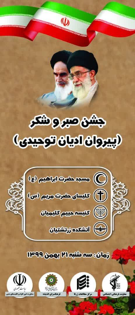 به گزارش حلقه وصل، معاونت فرهنگی اجتماعی سپاه با همکاری مشاورت اقوام و اقلیتهای دینی نهاد ریاست جمهوری، فرهنگسرای اندیشه و انجمنهای رسمی ادیان توحیدی، در دهه مبارک فجر و چهل و دومین سال پیروزی انقلاب اسلامی جشن شکرگزاری با عنوان «صبر و شکر پیروان ادیان توحیدی» را در اماکن مذهبی هر یک از ادیان در مسجد حضرت ابراهیم (ع)، آتشکده آدریان، کلیسای حضرت مریم (س) و کنیسه حییم کلیمیان برگزار میکند.