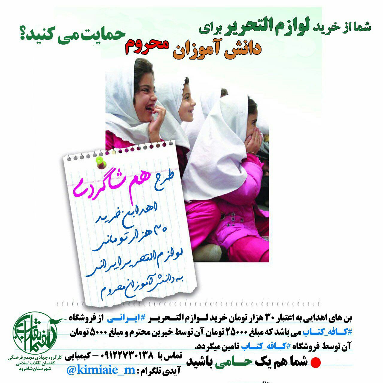 کیمیایی تصریح کرد: در واقع هر خیر با مبلغ 25 هزارتومان یک بن تهیه و در اختیار دانش آموز قرار می گیرد تا با مراجعه به کافه کتاب تا مبلغ 30 هزارتومان هر لوازم التحریری را که لازم دارند البته به شرط ایرانی بودن تهیه نمایند.