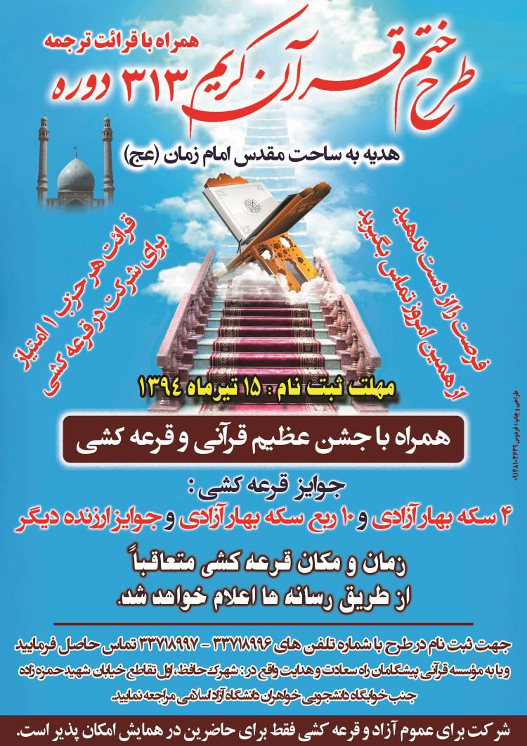 هژبری ادامه داد: طرح بزرگ ختم قران کریم با قرائت ترجمه، هدیه به ساحت مقدس امام زمان(عج) از دیگر برنامههاست که شرکت کنندگان در طرح در مراسم قرعه کشی خاتمین طرح با قرعه کشی با جوایز نفیس تجلیل خواهند شد.