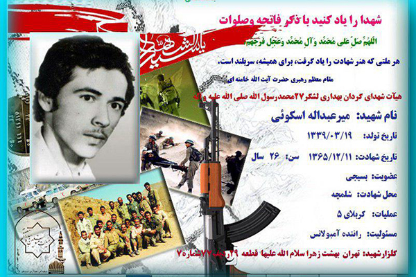 من كه اوضاع را چنين ديدم و احساس كردم خيلی در افكار خودش است، كنارش نشستم و گفتم: «ببخشيد. احساس میكنم در افکار خودت غرق هستی. كمكی از من برمیآید تا خدمتی كرده باشم؟» تبسمی كرد و گفت: «از لطف شما ممنونم» بعد ادامه داد: «من ميرعبدالله اسكويی هستم. ديگر از اين دنيا خسته شدم. برایم دعا كن و از خدا بخواه شهيد شوم» گفتم: «ان شاالله كه مشكلات همه برطرف شود و سرانجام همه ما پس از سالها زندگی عزتمندانه و موفقيتهای پياپی با شهادت همراه باشد»