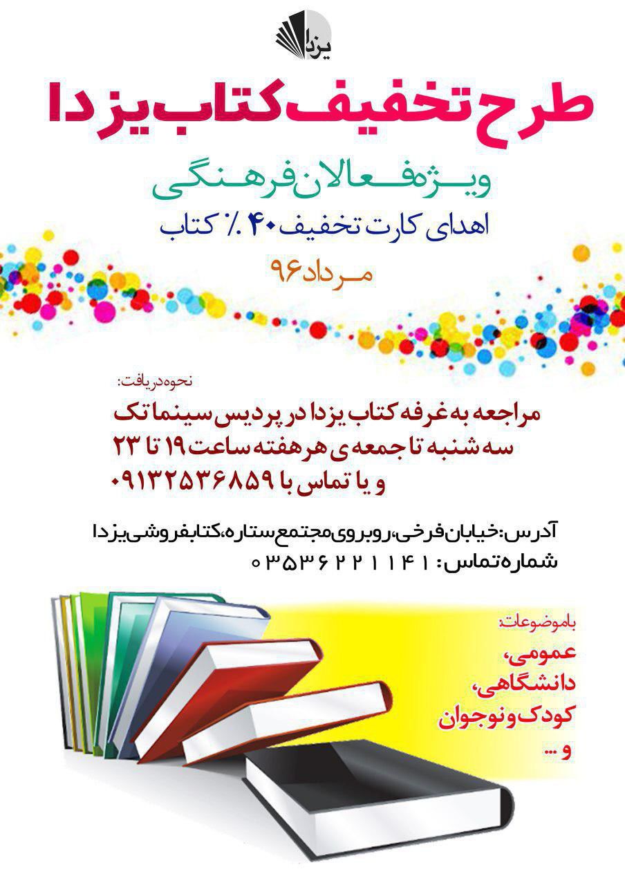 فعالین فرهنگی تا پایان مردادماه فرصت دارند جهت استفاده از این تخفیف به کتابفروشی یزدا واقع در خیابان فرخی روبروی مجتمع ستاره و یا غرفه کتاب یزدا در پردیس سینما تک مراجعه نمایند.