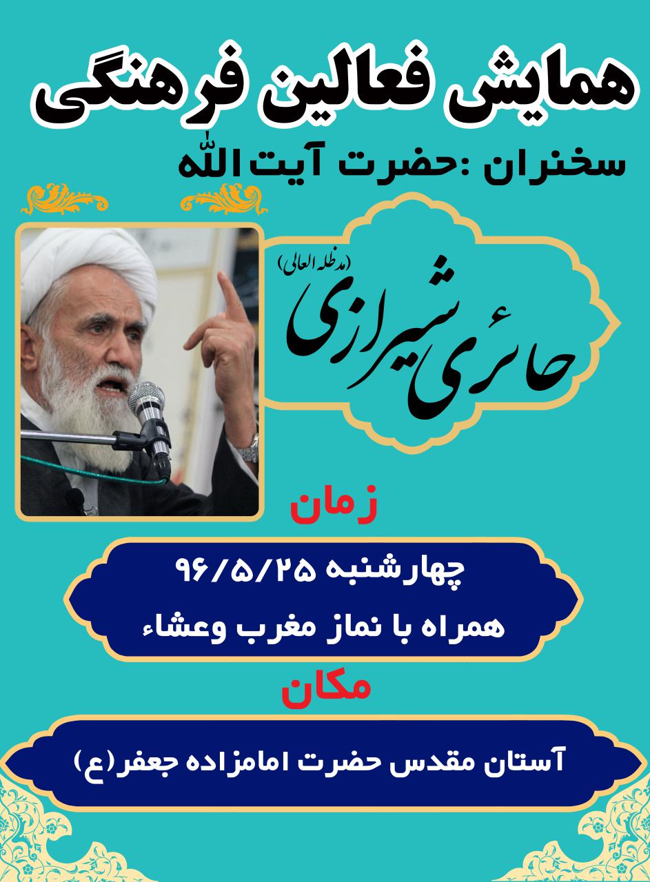 این جلسه ویژه فعالین فرهنگی شامگاه چهارشنبه 25 مردادماه همراه با نماز مغرب و عشاء در آستان مقدس امامزاده جعفر(ع) برگزار می شود.