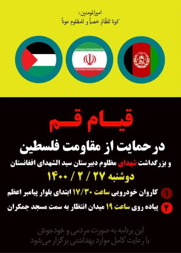 مردم قم یک بار دیگر حمایت خود را از مردم مظلوم فلسطین و افغانستان در این برنامه نشان می دهند.