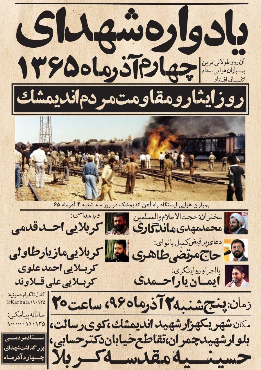 مراسم گرامیداشت روز ایثار و مقاومت مردم اندیمشک با سخنرانی حجت الاسلام و المسلمین محمد مهدی ماندگاری , مداحی احد قدمی, مازیار طاولی, احمد علوی, علی قلاوند, اجرا و روایتگری ایمان یار احمدی و قرائت دعای کمیل توسط مرتضی طاهری همراه خواهد بود.