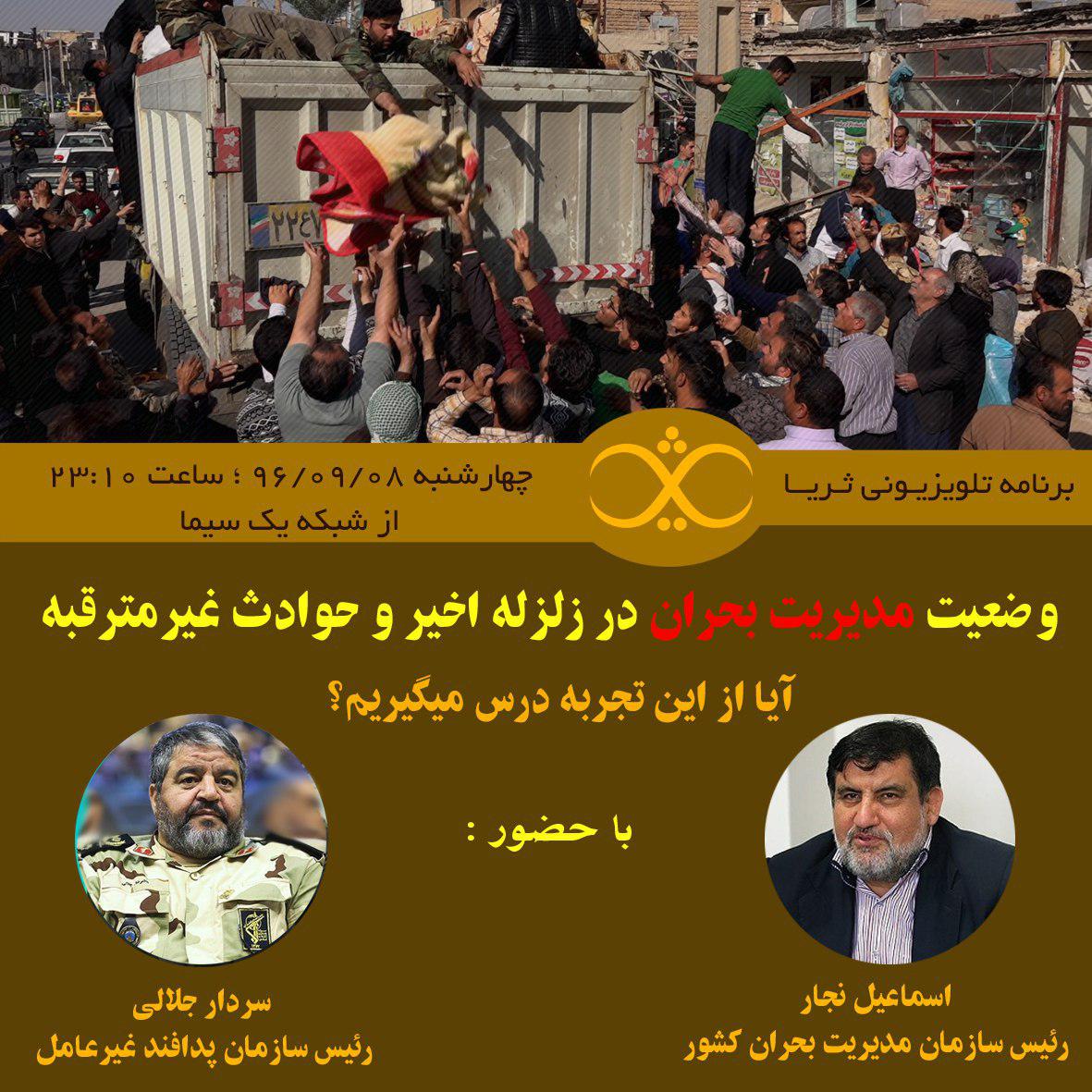 به گزارش حلقه وصل، برنامه این هفته «ثریا» با موضوع نقد و بررسی وضعیت مدیریت بحران در زلزله اخیر با حضور اسماعیل نجار، رئیس سازمان مدیریت بحران کشور و سردار غلامرضا جلالی، رئیس سازمان پدافند غیرعامل کشور روی آنتن شبکه اول سیما رفت.