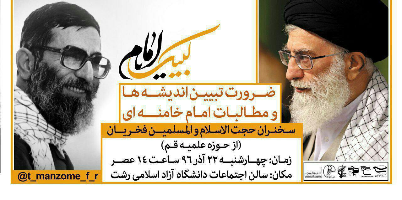 به گزارش سرویس استان های حلقه وصل، نشست ضرورت بیین اندیشه ها و مطالبات امام خامنه ای ویژه دانشجویان و فعالان فرهنگی گیلان برگزار می شود.