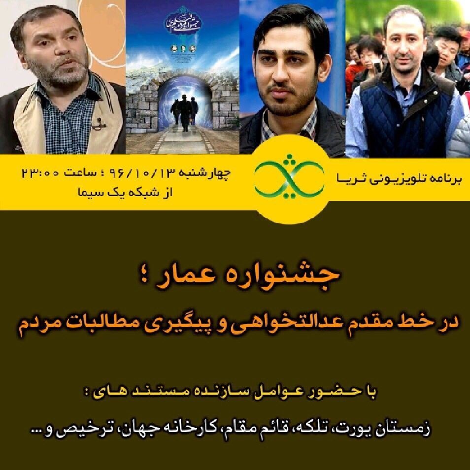 به گزارش حلقه وصل، برنامه تلویزیونی «ثریا» امشب چهارشنبه(13 دیماه) با موضوع «جشنواره عمار؛ در خط مقدم عدالتخواهی و پیگیری مطالبات مردم» به روی آنتن شبکه یک سیما میرود.