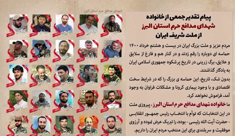 ما خانواده شهدای مدافع حرم استان البرز، پیروزی ملت در این انتخابات که توأم با انتخاب رئیس جمهور انقلابی - حضرت آیت الله رئیسی - بوده، را تبریک عرض کرده و آرزوی موفقیت و سربلندی برای این منتخب مردم ایران را داریم.
