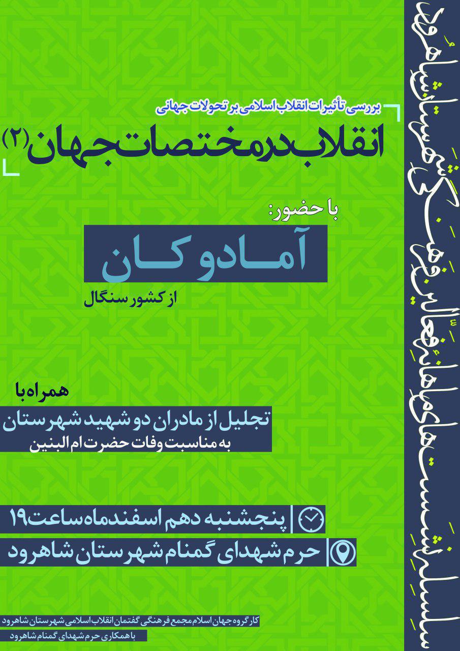 این فعال فرهنگی تصریح کرد: در این نشست نیز آمادو کان از کشور سنگال حضور خواهد داشت و همچنین از مادران دو شهید شهرستان شاهرود به مناسبت وفات حضرت ام الابنین(س) تجلیل خواهد شد.