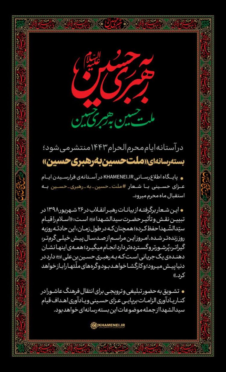 به گزارش حلقه وصل؛ پایگاه اطلاعرسانی KHAMENEI.IR در آستانه فرارسیدن ایام عزای حسینی با شعار «ملت حسین؛ به رهبری حسین» به استقبال ماه محرم میرود.