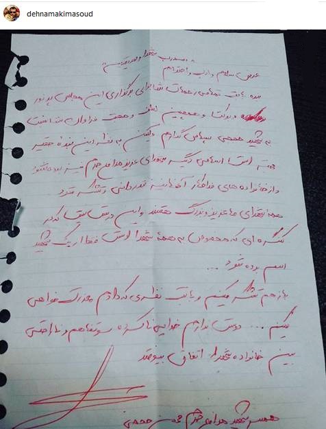 به گزارش حلقه وصل، مسعود دهنمکی با انتشار این عکس در اینستاگرامش نوشت: اسم این نامه را می شود گذاشت اخلاص در خانواده وقتی همسر شهید حججی از مسولان می خواهد دیگر شهدای حرم را بیشتر یاد کنند. این نامه در نجف اباد و در کنگره بزرگداشت شهدای حرم در حین سخنرانی به دستم رسید.