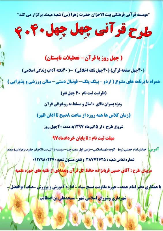 به گزارش سرویس استان های حلقه وصل، مؤسسه فرهنگی قرآنی بیت الاحزان حضرت زهرا(س) شعبه ی میمند فارس طرح تابستانه ی «چهل چهل» را ویژه پسران 10 سال به بالا که تسلط بر روخوانی قرآن دارند اجرا می کند.