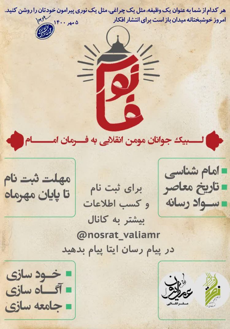 مسئول مقر انقلابی عماریون اردکان اضافه کرد: خواهران و برادران علاقه مند جهت ثبت نام و کسب اطلاعات بیش تر می توانند به آی دی @valiamr_amozesh پیام دهند.