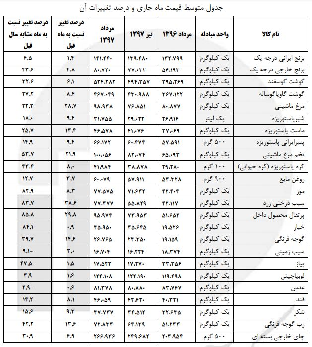 بر اساس نتایج به دست آمده در مرداد ماه ١٣٩٧، بیشترین افزایش قیمت در ماه جاری نسبت به ماه گذشته، مربوط به اقلام «سیب درختی زرد» با ٣٨.٦ درصد افزایش، «پرتقال محصول داخل» با ٢٩,٨ درصد افزایش و «مرغ ماشینی» با ٢٨.٧ درصد افزایش بوده است. در این ماه هیچ گونه کاهش قیمتی نسبت به ماه قبل وجود نداشته است.
