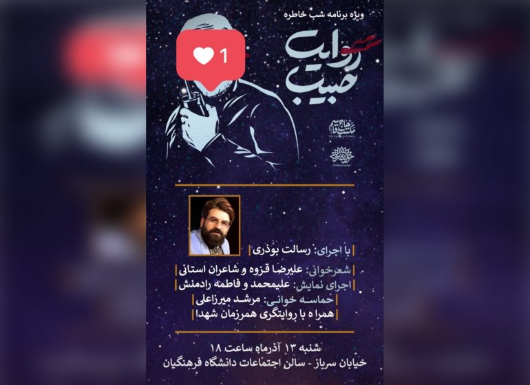 ویژهبرنامه شب خاطره «روایت حبیب» عصر امروز ۱۳ آذرماه ساعت ۱۸ در سالن اجتماعات دانشگاه فرهنگیان کرمان، به نشانی خیابان سرباز با اجرای رسالت بوذری برگزار میشود.