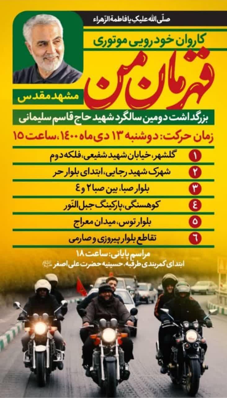 حلقه وصل: به مناسبت دومین سالگرد شهادت حاج قاسم سلیمانی کاروان خودرویی موتوری «قهرمان من» در مشهد حرکت می کند.