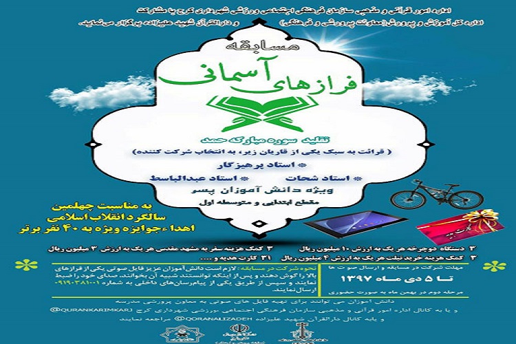 به گزارش سرویس استان های حلقه وصل، این مسابقه به همت دارالقرآن شهید علیزاده با همکاری اداره امور قرآنی و مذهبی سازمان فرهنگی، اجتماعی شهرداری کرج به مناسبت چهلمین سال پیروزی انقلاب اسلامی برگزار میشود.