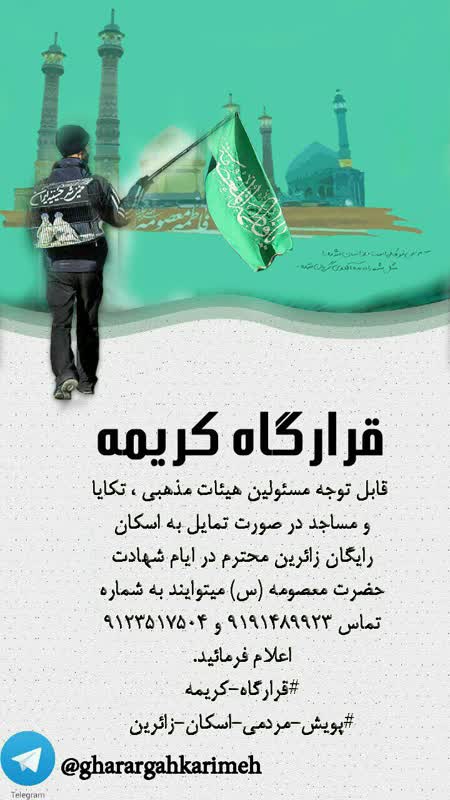 مسئول قرارگاه کریمه یادآور شد: تکایا، مساجد و هیئت های مذهبی و حسینیه ها که تمایل به اسکان رایگان زائران در ایام شهادت حضرت معصومه(س) دارند می توانند با شماره 09123517504 تماس بگیرند.