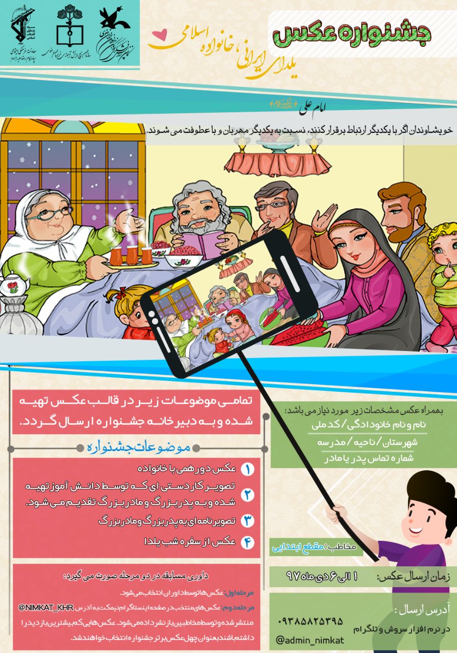 در این جشنواره که با عنوان «یلدای ایرانی خانواده اسلامی» برگزار می گردد دانش آموزان می توانند تصاویری از شب یلدای خانوادگی خود تهیه و ارسال کنند.