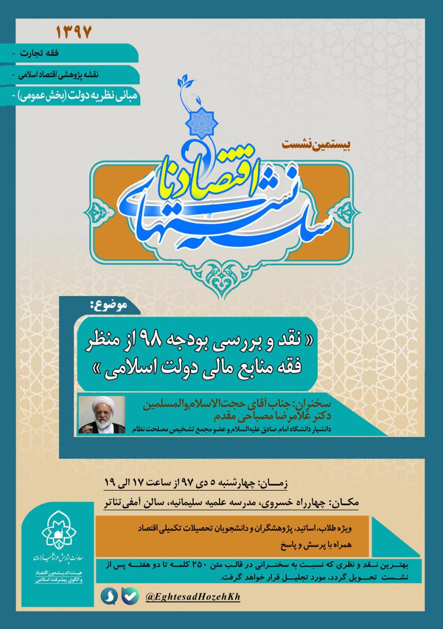 در این نشست بودجه 98 از منظر فقه منابع مالی دولت اسلامی با ارائه ی حجت الاسلام دکتر مصباحی مقدم دانشیار دانشگاه امام صادق(ع) وعضو مجمع تشخیص مصلحت نظام مورد نقد و بررسی قرار می گیرد.